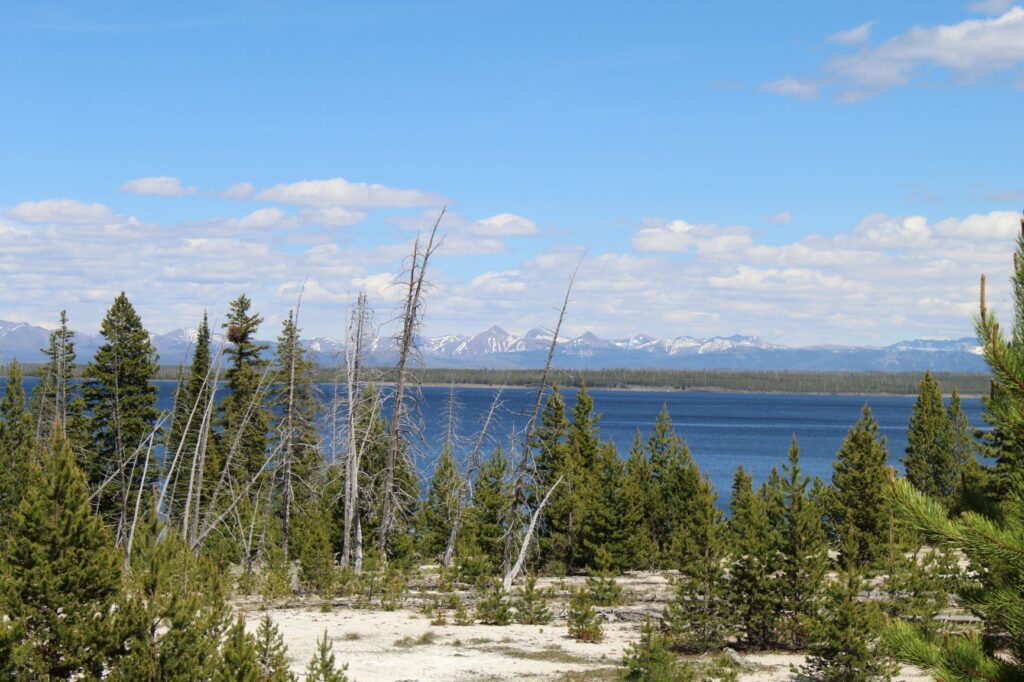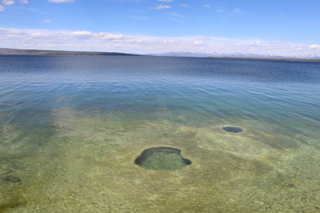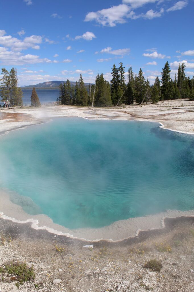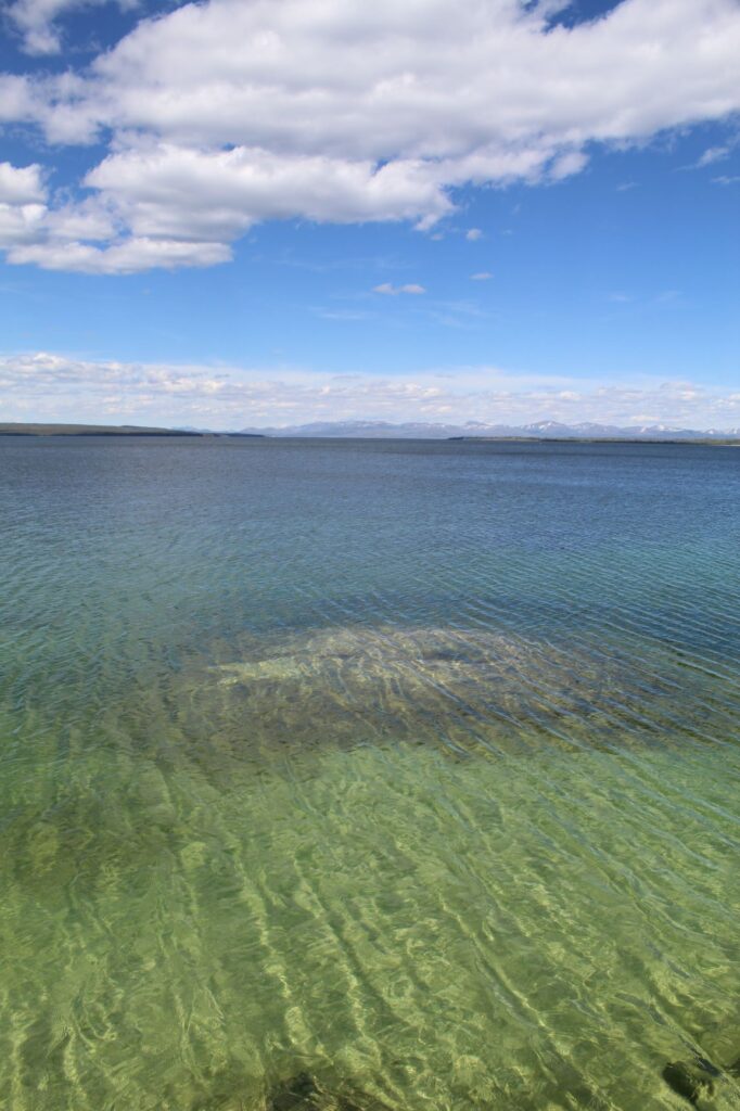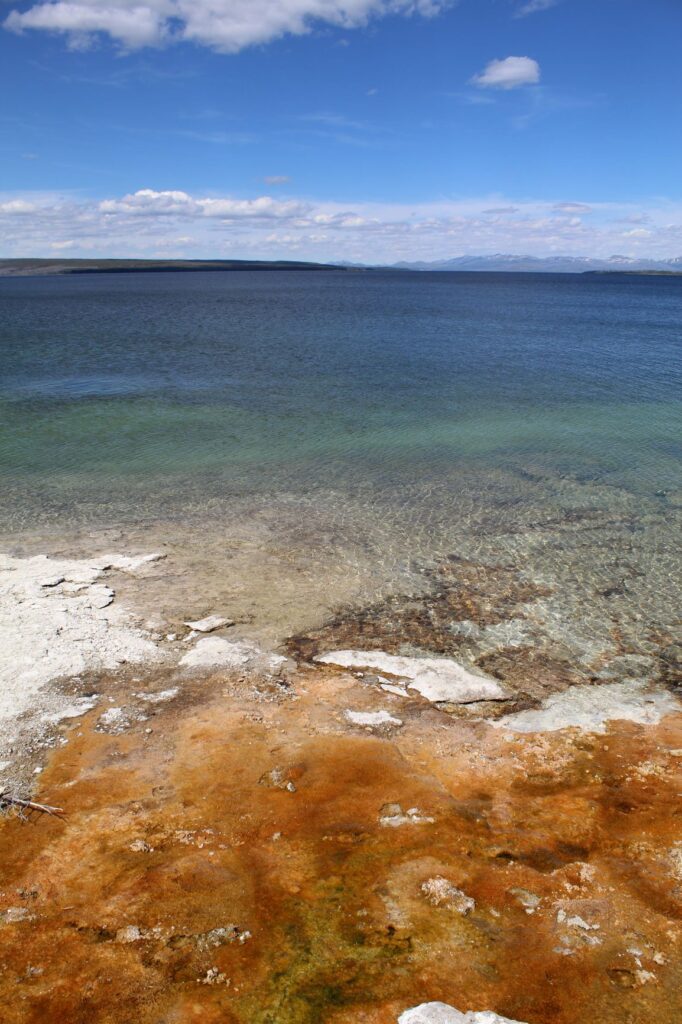 Ce qu’il y a de magique dans West Thumb c’est que cet ensemble de geysers et de sources d’eau chaude se trouve au bord de l’immense et remarquable lac Yellowstone. Le bleu de l’Abyss Pool se prolonge ainsi dans l’azur des flots du lac qui compte lui aussi des sources d’eau chaude et des geysers…en souterrain. Le Lac Yellowstone à 2500 mètres d’altitude est le plus grand lac d’Amérique du Nord à cette hauteur-là. En hiver, il paraît que sa surface gèle complètement mais là, en été, c’est une large et calme (on verra plus loin que le lac n’est pas si calme que ça) étendue d’un bleu profond. Au loin, on aperçoit la chaîne de montagne Absaroka qui ceinture le lac.